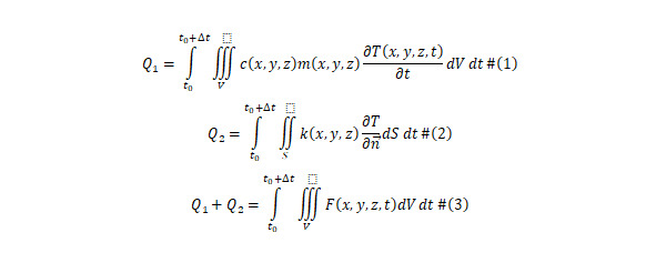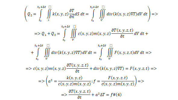 Для этого применяется модель смежного уравнения – уравнения теплопроводности, для вывода которого используется трижды интегральная форма теплоёмкости (1) и дважды интегральная форма теплопроводности (2), для которых действует выражение (3).