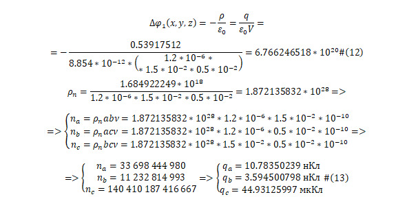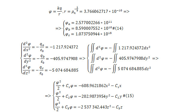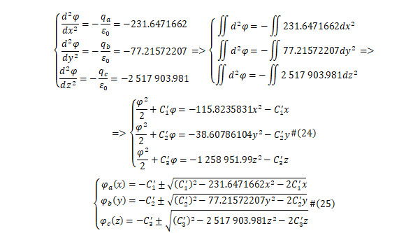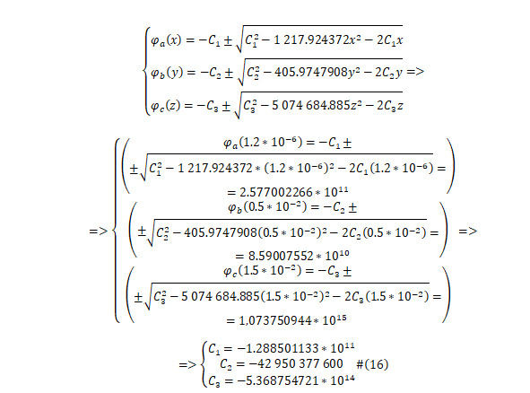 Значения зарядов относительно каждой плоскости могут перевести в значения потенциалов, согласно (14), откуда определяются потенциалы непосредственно в каждой из плоскостей, но для перевода полученных констант в вид функции необходимо использовать отдельно взятые электростатические уравнения Пуассона по каждому из измерений (15).