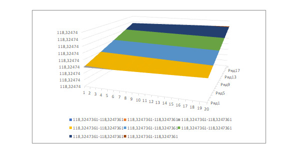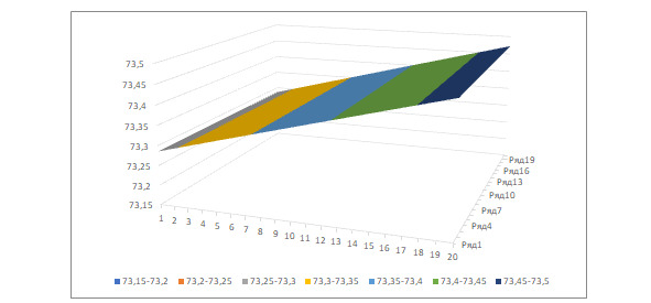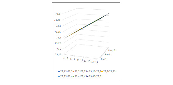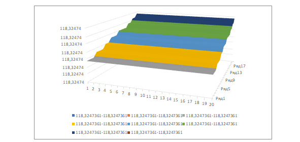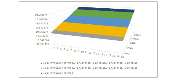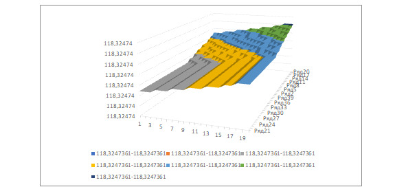 Сформулированные функции является трёхмерными и возможны к реализации посредством организации трёхмерных диаграмм относительно каждой проекции. Каждая из функций могут быть реализованы в 2 масштабах – относительно 10—3 и 10—2 единицы по x, y (Рис. 8—10) и 10—5 и 10—6 единицы относительно этих же переменных (Рис. 11—13), при этом обратив внимание, что при увеличении точности и уменьшении разности единиц трёхмерных график становиться более приближённый к дискретной формулировке, что также доказывает квантово-дискретную модель, к которой сводиться изначально аналитическое формирование.