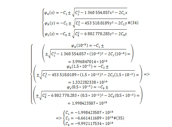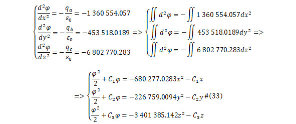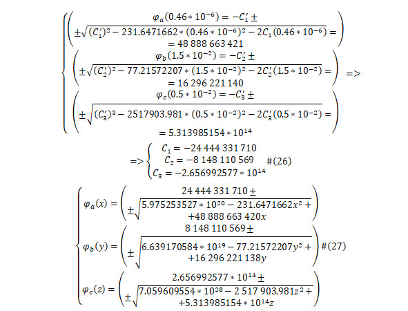 Каждая из произведённых вычислений становятся граничными условиями в масштабе дальнейший вычислений. Так при учёте, что полученные значения являются общими показателями заряда в каждой из проекций слоя кристаллического кремния, то для выведения выражения функций по каждой из указанных проекций, возможно использование уравнения Пуассона относительно каждой проекции. При этом, это также формируется исходя из в дальнейшем сводящий выражений по объёму, что коррелируется при моделировании трёхмерных графиков. Так, на данный момент известные значения, создают следующую систему изначально обыкновенных дифференциальных уравнений второго порядка, затем в вид системы дважды интегральных уравнений и в результате выражения переходят в форму алгебраических уравнений (33).