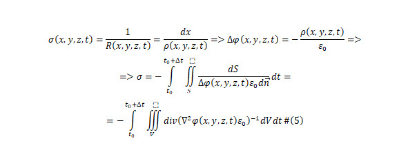 В данном случае изначально принимается динамическая характеристика, относительно электропроводности в силу того, что изначальная задача по определению динамическая, что делает выведенное выражение отличным от классической задачи электропроводности в статическом виде. Также в данном случае использовано преобразование лапласиана относительно оператора Набла и градиента, как это было использовано ранее в случае теплопроводности. Следующей стадией является определение электроёмкости (6) и приведение аналогичного выражения для суммы электроёмкости и электропроводности (7).