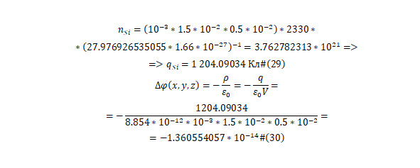 Изучение свойств кристаллического кремния начинаются со стации формирования его электронной конфигурации, которая уже ранее была произведена в (18), откуда следует наличие дополнительных двух электронов на внешней орбите кремния, что делает полупроводник в виде кристаллического кремния насыщенным электронами. Для вычисления общего числа зарядов и общего заряда каждого из взятых зарядов могут быть вычислены в (29), что может также использоваться в организованном дифференциальном уравнении в частных производных – электростатическом уравнении Пуассона (30).