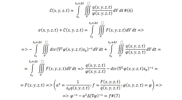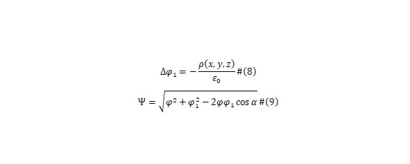 Таким образом было сформулировано дифференциальное уравнение в частных производных, описывающее явление электропроводности, которое может быть преобразован в последующем. Для явлений электромагнитного поля используется уравнение Пуассона для электростатического поля (8), которое будет оказывать влияние на уравнение (7) и поскольку каждый из функций описывает явление в векторном пространстве со своими единичными элементами, то по определению функционального анализа относительно них может быть использован метод векторного сложения (9), что также лишний раз подтверждается участием оператора Набла в (7) таким образом выведя результирующий вид функции относительно заданного явления, при чём каждый из функций в (9) является решением динамических дифференциальных уравнений в частных производных (7) и (8), соответственно.