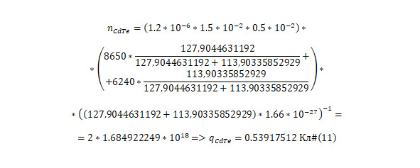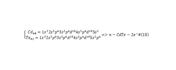 Из полученной картины наглядно видно, что кадмий, используемый в соединении, имеется 2 электрона на внешней оболочке, однако на внешней оболочке теллура, которым он легируется имеется 4 электрона, к тому же до заполнения внешней орбиты теллура не хватает 2 электронов относительно p-орбитали, благодаря чему всё соединение имеет 2 внешних электрона. В силу этого, в соединении имеется большое количество свободных электронов, общее число которых может быть вычислено через (11), в том числе в силу вычисляемого заряда.