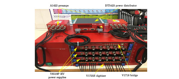 – Three V6519P HV power supply modules provide the high voltage (up to 500 V and 3 mA of voltage and current, respectively) to the de tectors. Each one houses 6 HV power supply channels that are controlled by software. The channels share a common floating return which allows on-detector grounding, reducing the noise level. HV outputs are delivered by SHV connectors [20].– The V1725S digitizer consists of 16 (0—15) input channels capable of recording waveforms (directly from the preamplifiers A1422 [17]) along with performing advanced algorithms for online DPP [21]. Using DPP f irmware, we are able to acquire the integrated charge and carry out PSD (Pulse Shape Discrimination) and PHA (Pulse Height Analysis), as well as read out waveforms with automatic pulse identification. It features 14 bit resolution, 250 MS/s sampling rate, and 2 V input range. This implies a digital precision of 0.12 mV and a digital resolution of 0.006%, with a processing time of 65 µs. Communication with the board can be done through the VME bus and Optical Link. It is well suited for mid fast pulses such as the ones coming from silicon detectors coupled to the charge sensitive preamplifiers A1422 [17].