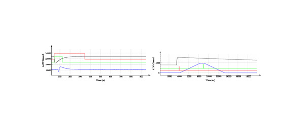 (a) PSD firmware. The input signal (black) within the long and short gates (red and green squared pulses). At the bottom, we have the constant fraction discriminator (CFD) signal (blue). (b) PHA firmware. The input signal (black with long tail), the fast trigger (left red), and the trapezoid filter (blue) with the peaking signal (green) just below the trapezoid. Figure 2: CoMPASS screenshots showing different electronic signals for (a) PSD firmware, and (b) PHA firmware.