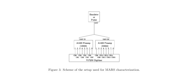 As a proof of concept and validation, MARS has been firstly tested in a laboratory environment. Figure 3 schematize the first setup used to characterize the MARS electronic system. The test pulses were generated by the 419 ORTEC precision pulse generator [25] or the digital detector emulator DT4800 [26]. Both modules allow for emulating electronic pulses that simulate the detection of a charged particle in a silicon detector. The former works at a fixed frequency of 70 ± 10 Hz [25], while the latter can be set to different values. The DT4800 allows for emulating pulses with time and amplitude follow ing Poisson distributions. It allows for loading spectra from different sources, simulating their emission rate and pulse height distribution. It also allows for modifying the rise and decay times of the pulses. It is worth mentioning that pulses were initially delivered through the com monTESTIN (input) of A1422 preamplifiers. In practice, the electronic signals, coming from detectors, must be transmitted through individual DET IN elec tronic chains. However, unlike DET IN, TEST IN has a 50 Ω termination in series with a 1 pF capacitance. Further measurements were performed using a triple alpha source placed in front of detectors, which were then connected to individual A1422 DET IN. According to Figure 3, MARS system is divided into 8 individual electronic chains (1- 8) related to each A1422 (13323 and 13324) preamplifier and 16 data acquisition (DAQ) chains (0- 15) related to the V1725S digitizer. These numbers coincide with the numbers printed, respectively, in the front panel of A1422 preamplifiers and V1725S digitizer.