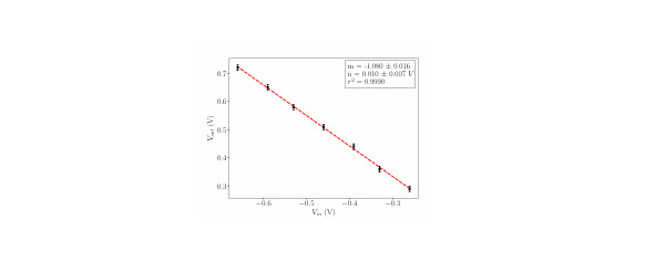 IN (input). Pulse amplitudes were then measured, at each individual A1422 output, using a digital oscilloscope from Tektronix, model TBS1072B [27]. Thus, we determine the relation between the amplitudes of the A1422 input and output pulses, i. e. its amplification factor (F). Table 1 presents the amplification factor (F), obtained for each electronic chain (Vout/Vin) and the average value (F), obtained for each A1422. Since preamplifiers invert the pulse, the Table 1 refers to absolute values. In Table 1, the A1422 are discriminated by their series number: 13323 and 13324. From Ta ble 1, the F average values are 1.075 (34) for the A1422—13323 and 1.084 (39) for the A1422—13324. Relative uncertainties are, respectively, 3.2% and 3.6%. Con sidering statistical errors (standard deviation (σ)), both values are compatible in 1σ. As an example, Figure 4 plots the relation between the input and output pulse heights, with the respective fit, for the first electronic chain (1) of the