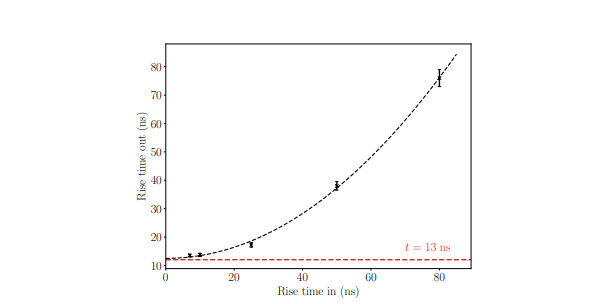 (a) Output rise time as a function of the input rise time. Input pulses with fast rise times (<15 ns), saturate at around 13 ns