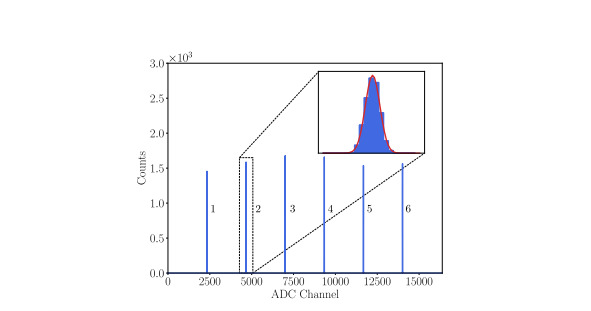 Figure 6: Spectrum obtained for different pulse heights emulated from DT4800, with the setup of Figure 3. Each peak has been fitted using a Gaussian model in order to determine the FWHM