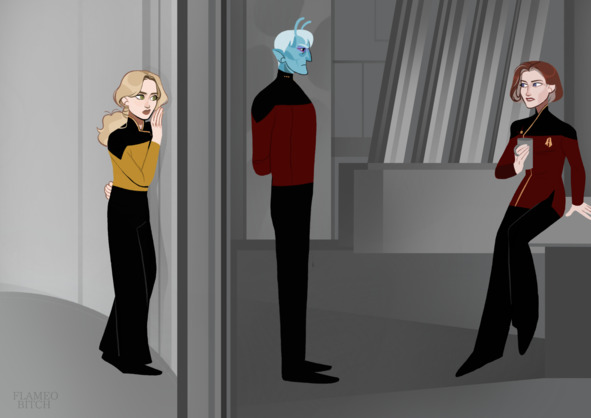 Когда двери турболифта открылись, она несколько неуверенно вошла, оглядывая совершенно новое для неё пространство. По обе руки её встречали панели, за которыми работали офицеры, а чуть ниже располагались кресла капитана и старшего помощника, которые сейчас отнюдь не пустовали. Ещё ближе к огромному экрану сидел рулевой, внимательно следящий за какими-то показаниями. Но больше всего взгляд привлекал вид на безграничный космос. Это не могло сравниваться ни с видом из столовой, ни уж тем более с нижних палуб. Это был космос, будоражащий исследовательский дух, а не просто служащий унылым фоном.