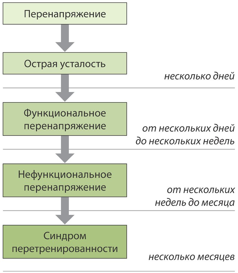 Время для полного восстановления указано для каждой стадии. Несколько трудных, умеренно или высокоинтенсивных тренировок могут истощить имеющиеся источники энергии и вызвать краткосрочную (острую) усталость, которая лечится правильным питанием и сном. Функциональное перенапряжение должно быть спланировано так, чтобы имитировать физиологическое напряжение, испытываемое во время соревнования, однако несколько дней отдыха и здорового питания перед соревнованием необходимы, чтобы помочь мышцам полностью восполнить запасы энергии. Важно делать период отдыха относительно коротким, потому что детренировка – потеря силы или аэробной выносливости – может произойти уже через две недели без высокой физической активности. Тем не менее недостаток должного отдыха между завершением фазы переутомления и соревнованием может привести к плохим результатам, четкому признаку нефункционального переутомления. (Примечание. Нефункциональное перенапряжение также может произойти в результате участия в событии, продолжающемся несколько дней, таком как турнир или гонка. Для эффективного возвращения к гомеостазу требуется спланированная стратегия восстановления.)