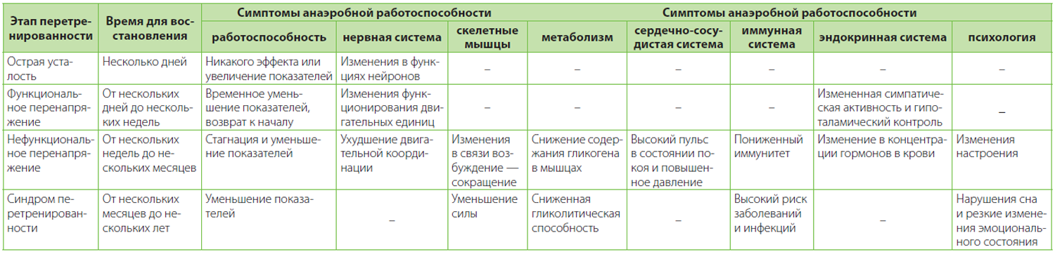 С тех пор, как Снайдер и Хэкни написали это в начале 2010-х годов, исследователи изучили, как смягчить последствия накопленного стресса, и теперь гораздо лучше понимают необходимость правильного отдыха для возможности адаптаций и предотвращения переутомления. Недостаточный отдых между высокоинтенсивными сессиями или занятие спортом на протяжении нескольких дней подряд наиболее вероятно вызывают синдром перетренированности. Он может привести к хронической усталости, снижению физической активности, изменениям настроения, дисбалансу нейроэндокринной системы и частым заболеваниям. Проблема в том, что сложно определить разницу между усталостью после единичной тренировки и перетренированностью из-за чрезмерных физических нагрузок, поскольку нет одного физиологического маркера, указывающего на этот синдром. Общие симптомы синдрома перетренированности указаны в таблице 1.1.