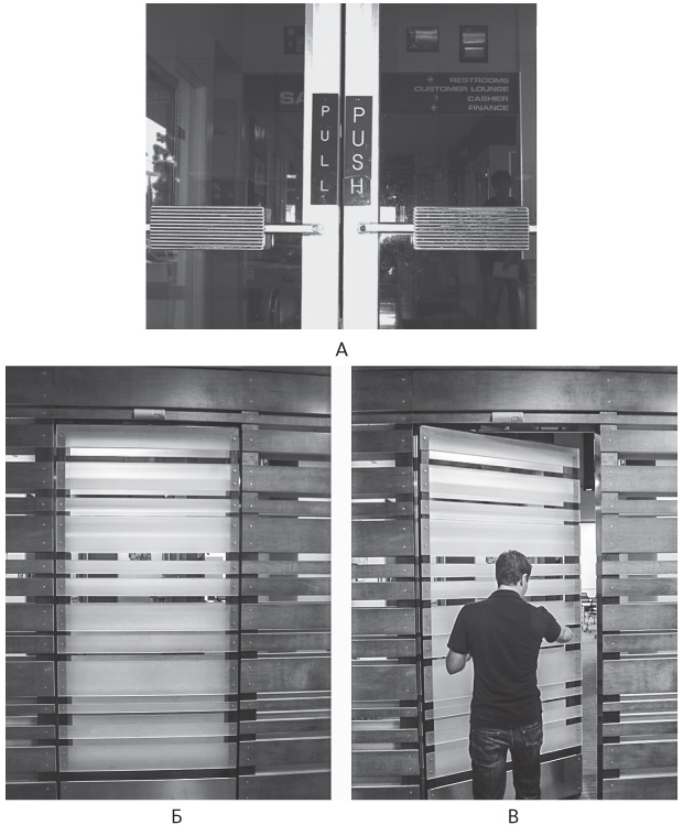 Устройство двери может без каких-то дополнительных знаков говорить о том, открывается она от себя или на себя. Однако устройство двух дверей на фото наверху (А) одинаковое, несмотря на то, что одну нужно тянуть, а другую – толкать. Плоская ребристая горизонтальная полоса естественным образом воспринимается как наличие возможности толкать дверь, но, как гласит надпись, левую дверь нужно открывать на себя, а ту, что справа, – от себя. На паре нижних фотографий (Б и В) нет никаких видимых означающих, которые говорили бы о возможностях. Как человеку догадаться, какую сторону толкать? Методом проб и ошибок. Когда к чему-то такому простому, как дверь, приходится добавлять внешние означающие – знаки, – это говорит о плохом дизайне.