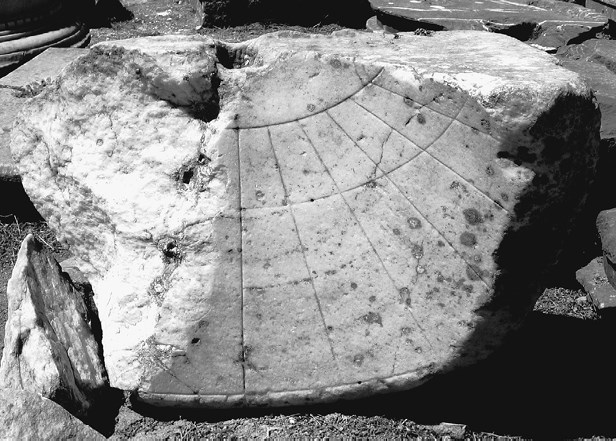 Еще большей популярностью обладали так называемые конические солнечные часы (ил. 46). Если не присматриваться, их легко перепутать с часами в виде срезанной полусферы. Потребность в конструировании всех этих часов оказала сильное стимулирующее воздействие на астрономию и геометрию. Проблема становилась особенно актуальной, когда поверхность, на которую падала тень, была плоской – не важно, горизонтальная она или вертикальная; и здесь, если верить Витрувию, Аристарх ввел небольшое усовершенствование. Типичный пример ранних солнечных часов с плоским циферблатом приведен на ил. 47. Спустя два столетия после смерти Аристарха население Афин смогло ознакомиться с замечательным экземпляром часов с плоским циферблатом на Башне Ветров на рыночной площади Агоре. Будучи возведенной в 50 г. до н. э., эта башня стоит до сих пор, и многие из часовых линий ее солнечных часов все еще различимы. Вне всякого сомнения, самые помпезные солнечные часы с плоским циферблатом времен Античности были установлены в Риме в честь празднования победы Августа в Египте в 30 г. до н. э. В настоящее время их гномон, привезенный из Гелиополя, находится на Пьяцца ди Монте-Читорио. Он представляет собой 22‐х метровый обелиск, увенчанный бронзовым глобусом. Оставшееся от пространного посвящения выложено бронзовыми буквами на мраморной мостовой, в наши дни скрытой под наслоениями других, более поздних построек, однако некоторые ее части извлекли во время раскопок, и особого внимания заслуживает то, что найденные буквы были буквами из греческого алфавита.