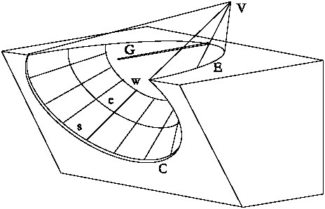 Фрагмент «конических» солнечных часов, найденных на месте бывшей центральной площади в Камире на острове Родос. Этот тип часов был широко распространен в Древней Греции, и до наших дней дошло около ста сохранившихся экземпляров. Витрувий приписывал их изобретение блестящему геометру Дионисодору из Кавна (250–190 гг. до н. э.). Вогнутая поверхность с прочерченными на ней часовыми линиями представляет собой часть конуса (на схематической реконструкции его вершина обозначена точкой V, а дуга кругового основания – точкой C). Гномон (G) занимает горизонтальное положение, а часы определяются по его тени в зависимости от сезона. Треки, вдоль которых должны были считываться часы, содержат метки, соответствующие крайним сезонным положениям: s – для летнего солнцестояния, w – для зимнего солнцестояния и e – для равноденствий. Часть конуса на верхней поверхности плиты имеет эллиптическую форму. Вполне вероятно, что проектирование таких часов считалось хорошим стимулом для изучения математических свойств конических сечений.