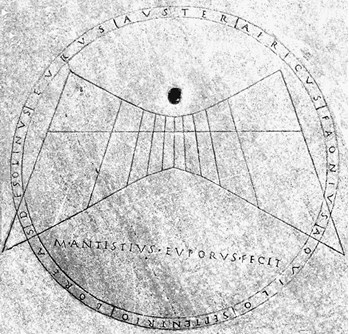 Римские горизонтальные солнечные часы с плоским циферблатом, датируемые приблизительно I в. до н. э. Найдены в храме Юпитера в городе Аквилее. Юг расположен в направлении верхней части рисунка. Углубление предназначено для установки гномона. По краю окружности, диаметр которой составляет примерно 66 сантиметров, написаны имена восьми ветров. Подписаны именем изготовителя – Марка Антистия Евпора. Несмотря на то что такие часы были проще в изготовлении, чем конические, они дошли до нас в гораздо меньшем количестве, поскольку плоские плиты часто повторно использовали в других целях.
