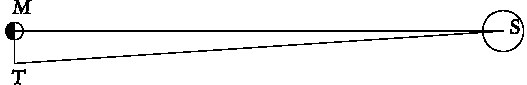 Аристарх подготовил почву для постановки подобного рода вопросов, но не обеспечил их удовлетворительными эмпирическими ответами. В числе его базовых предположений было освещение Луны Солнцем; в тот момент, когда Луна представляется нам освещенной ровно наполовину, глаз наблюдателя находится на дуге большого круга, разделяющего светлую и темную области. (См. ил. 49, где T – это Земля, S – Солнце, а M – Луна.) Затем он предположил, что угловые диаметры Солнца и Луны одинаковы, так как они в точности совпадают во время затмения Солнца Луной. (Это следует из следующего его утверждения: в момент затмения по краям затмеваемого Солнца не образуется кольца, а фаза полного затмения длится очень недолго. Конечно, так бывает не всегда.) Его трактат довольно сложен с точки зрения геометрии, когда он переходит к вопросу о взаимных расстояниях и размерах светил, однако он содержит одно утверждение, легко поддающееся обсуждению. Сегодня его часто называют «дихотомией», от греческого слова, обозначающего деление надвое. Ничто не мешает нам в приведенном примере с освещенной наполовину Луной взять отношение отрезков TS к TM как величину, обратную косинусу угла MTS. Аристарх, не приводя никаких дополнительных оснований, утверждал, что искомый угол составляет 29/30 от четверти круга (87°). Если принять это значение, то, используя тригонометрические таблицы, можно легко получить искомое отношение расстояний до Солнца и Луны, оказывающееся равным 19,11. Аристарх не имел ни малейшего представления о косинусе, не говоря уже о таблицах значений этой функции, однако посредством длинных и громоздких геометрических рассуждений он сумел получить значение, которое оказалось «больше 18, но меньше 20». Для получения этого результата ему в процессе доказательства пришлось воспользоваться теоремой, эквивалентной записанной нами следующим образом:
