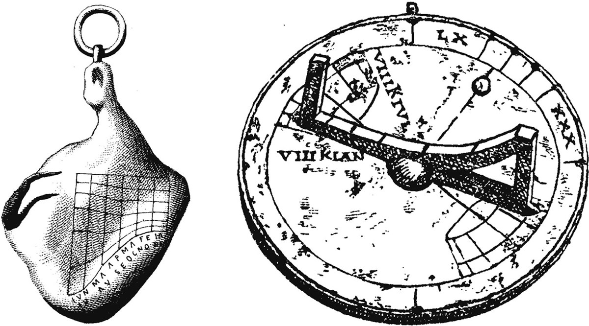 Портативные римские солнечные часы, найденные в Помпеях, а следовательно, изготовленные не позже извержения Везувия в 79 г. н. э. Сделаны из посеребренной бронзы в виде свиного окорока, в котором хвост выполняет функцию гномона. Подвесив часы в свободном состоянии, нужно было поворачивать их до тех пор, пока тень от верхушки гномона не достигнет вертикальной линии, соответствующей определенной дате. Каждая вертикаль обозначалась сокращенным названием месяца и соответствовала определенному положению Солнца на эклиптике. Каждая из поперечных линий, пересекающих вертикали, обозначала часы, которые считались отдельно для первой и второй половины дня. По всей вероятности, изогнутые часовые линии наносили с помощью таблицы, а не фактических наблюдений, производимых в течение года. Они определенно не основаны на каких-либо фундаментальных геометрико-астрономических положениях, как это было в случае полусферических, конических, плоских и цилиндрических часов. Витрувий отмечает, что «написано много инструкций по изготовлению подвесных часов для путешественников». Справа показан еще один, гораздо более сложно устроенный тип римских портативных часов с подвижными частями, вполне пригодных для точного определения времени. (Изготовлены, предположительно, в III в. н. э.; обнаружены в Братиславе, в настоящее время хранятся в Музее истории науки в Оксфорде.)