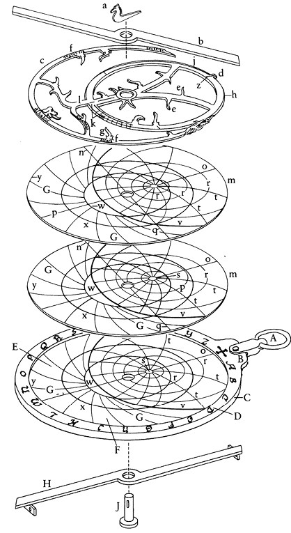 Изображение стандартной средневековой астролябии в разобранном виде. Все детали удерживаются вместе с помощью соединительного штифта с прорезью (показан внизу), сквозь которую продевается клин (в виде лошади). Самый верхний диск с прорезями – паук – представляет собой не что иное, как вращающуюся карту звездного неба, обычно (но не обязательно) обрезанную по тропику Козерога. Его внутреннее (эксцентрическое) кольцо обозначает эклиптику. Каждая из пластин (называемая тимпаном), поверх которых он может вращаться, содержит изображения линии горизонта, а также координатных и часовых линий. Для заданной географической широты требуется только один тимпан, но астролябия может быть снабжена несколькими тимпанами для многих различных широт или только для двух, если тимпан гравирован с обеих сторон. Тимпаны и паук укладываются внутрь круглой детали с высокими бортами, тарелки, обычно тоже гравированной как тимпан в целях экономии металла. Линейка на лицевой стороне нужна не для всех способов применения астролябии, но во многих случаях бывает полезна. Прицельная линейка (алидада) с диоптрами на обоих концах позволяет измерять углы тогда, когда инструмент используется для наблюдений. (Помимо наблюдений, он может применяться для проведения многих вычислений.) Кольцо и соединительная скоба на ободе тарелки позволяют наблюдателю, подвесив инструмент на большом пальце, удерживать его в вертикальном положении. После этого высоты небесных объектов могут быть измерены с помощью алидады и шкалы на тыльной стороне астролябии (не показанной на рисунке). Там же находятся и другие шкалы, в число которых обычно входит так называемая календарная шкала, устанавливающая соответствие между днем солнечного года и положением Солнца на эклиптике.
