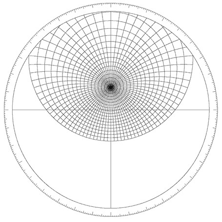 Главные линии стандартного тимпана астролябии, изображенные в данном случае для широты Оксфорда (51,8°). Линии одинаковой высоты и одинакового азимута (именуемые, соответственно, «альмукантаратами» и «вертикалами») обрезаны снизу кругом горизонта. Каждый набор линий нарисован с шагом в 5°, но не менее часто встречались тимпаны с 10-градусными интервалами, а самые точные инструменты могли содержать интервалы в 1°. (Сравните с ил. 53.) Внешняя градусная шкала обычно гравировалась на тарелке и не имела отношения к тимпану. (Она часто замещалась часовой шкалой – двадцать четыре часа на полный круг.) По поводу часовых линий, которые тоже обычно наносились на тимпан, но не показаны здесь, см. ил. 71.