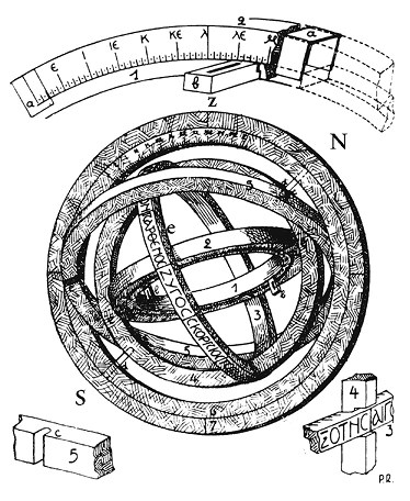 Армиллярная сфера, описанная Птолемеем в «Альмагесте». Надписанное кольцо, обозначенное буквой e, соответствует эклиптике. На кольце внутри нее, расположенном к ней под прямым углом, находятся передвижные визиры (см. верхнюю часть рисунка). Точки N и S помечают Северный и Южный полюса мира (обратите внимание на оси, на которых, в соответствии с суточным движением, вращаются все внутренние кольца), а точка z – зенит. (По рисунку инженера Пьера Рома из сочинения его брата Адольфа Рома, 1927.)