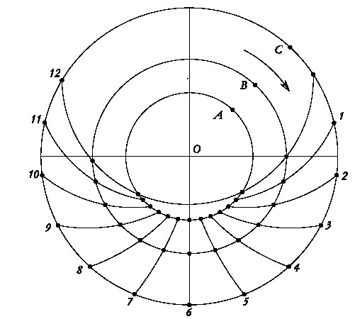 Одним из основных назначений астролябии было слежение за ходом времени. Каждой дате соответствует строго определенное положение Солнца на эклиптике. По мере того как паук поворачивается, следуя суточному движению, эта точка перемещается на 15 градусов за один (равный) час. Она пересекает меридиан ровно в полдень, и если паук (неважно каким образом) правильно установлен в исходный момент времени, то легко измерить угол между Солнцем и меридианом, а следовательно, определить время в текущий момент. Те, кто желал определить время в «неравных» (или «сезонных») часах, должны были использовать другие технические приемы. Солнце пересекает линию горизонта на тимпане во время заката (справа) и еще раз на восходе (слева). Если разделить угол, пройденный им в этом интервале, на двенадцать равных частей, то получим то, что принято называть ночным неравным часом. Линии на тимпане охватывают целый год. Солнце находится ближе всего к полюсу мира в середине лета (и описывает круг, помеченный на рисунке точкой A, – так называемый тропик Рака), а дальше всего – в середине зимы (этот круг обозначен буквой C – тропик Козерога). Астролябию обычно замыкали кругом Козерога. Нет никакой особой причины, вынуждающей проводить эту границу, хотя понятно, что какая-то граница необходима, поскольку невозможно уместить все небо в ограниченное пространство.