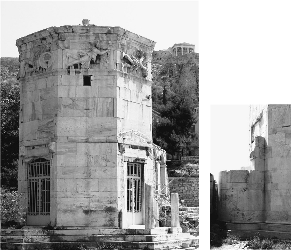 Башня Ветров, возведенная на старой Агоре в Афинах в начале I в. до н. э. македонским астрономом Андроником из Кирра. Восемь стен этого строения ориентированы по восьми сторонам света и декорированы фризом с рельефными фигурами, олицетворяющими соответствующие им ветры. Под ними – на стенах, расположенных на подсолнечной стороне, – сохранились следы нескольких солнечных часов с плоским циферблатом. Башня была увенчана бронзовым флюгером в виде фигуры Тритона. Внутри строения находились водяные часы, имеющие циферблат, форма которого воспроизводила астролябию, изготовленную в соответствии с техническими приемами, разработанными ранее Ктесибием и Филоном Александрийским. Вода подавалась по трубам от источника, находящегося в Акрополе, в резервуар водяных часов, сохранившийся до наших дней (см. правую фотографию).