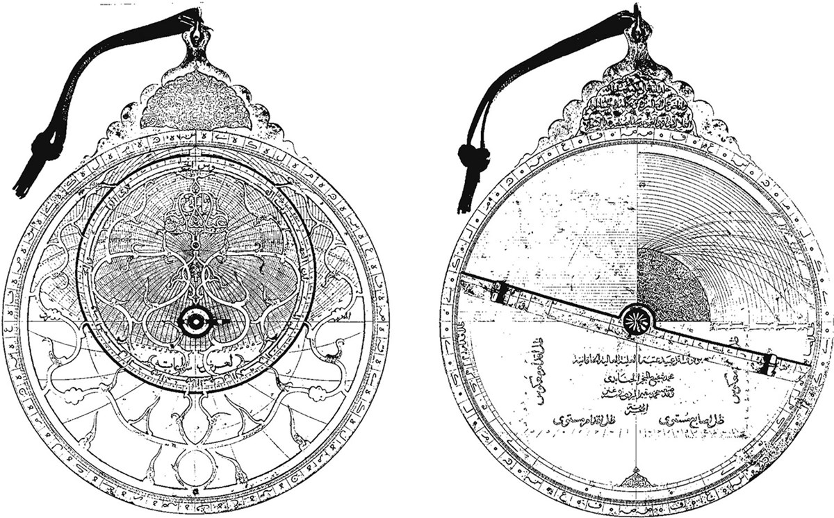 Персидская астролябия, изготовленная для сефевидского шаха Аббаса II. Показаны лицевая сторона (слева) с подвижным пауком, расположенным на неподвижном тимпане, и тыльная сторона (справа) с алидадой (прицельной линейкой) и различными тригонометрическими шкалами. Подписана Мухаммадом Мукимом ал-Язди. Датируется 1647–1648 гг. н. э. по европейскому календарю. Ее описание см. на с. 303 (Музей истории науки в Оксфорде. Инв. номер 45747.)