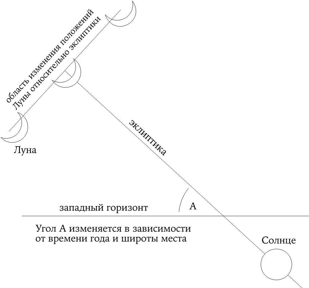 Первое наблюдение лунного серпа. Солнце находится ниже западного горизонта, линия его спуска не показана. (Она не совпадает с эклиптикой и определяется вращением неба вокруг Полюса мира.) Луна может находиться в пределах чуть более 5° в ту или другую сторону от эклиптики.