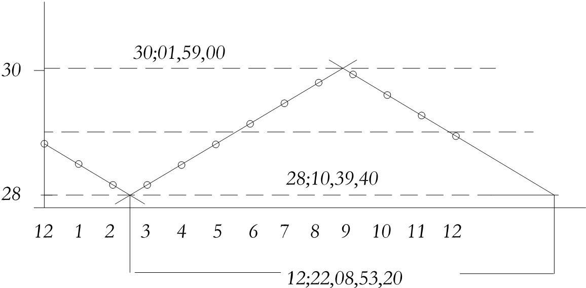 Можно легко посчитать период зигзагообразной функции в месяцах. На ил. 32 он записан в виде числа 12;22,08,53,20. Это значение соответствует продолжительности года, измеряемой в синодических месяцах. Его получили, очевидно, не прямыми наблюдениями, а с помощью одного из циклических соотношений, о которых мы упоминали ранее. Похоже, в данном случае использовалось равенство: 810 лет = 10 019 месяцев. Конечно, для выведения этих уравнений необходимо было проводить наблюдения, но поиск правильных числовых соотношений также играл свою роль. К сожалению, нам известны только итоговые результаты этих расчетов.