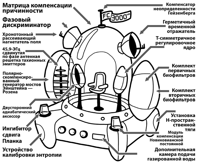 Пожалуйста, внимательно изучите элементы FC3000тм, изображенные на следующей странице. Федеральное законодательство требует проинформировать вас, что в соответствии с природой генетического и приобретенного иммунитета существует большое количество болезней, к которым современные люди обладают иммунитетом, но которые неизвестны человечеству прошлого. Для вашей безопасности и для безопасности тех, кто окажется рядом с вами, многослойные биофильтры, встроенные в FC3000тм, заботятся о том, чтобы ваше появление в прошлом не привело к полному уничтожению человечества как вида из-за дюжины принесенных вами смертоносных эпидемий (рис. 1).
