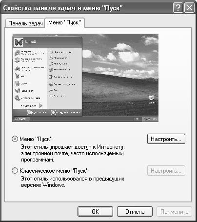 Рисунок 2.2. Диалоговое окно Свойства панели задач и меню «Пуск» позволяет изменять конфигурацию Главного меню