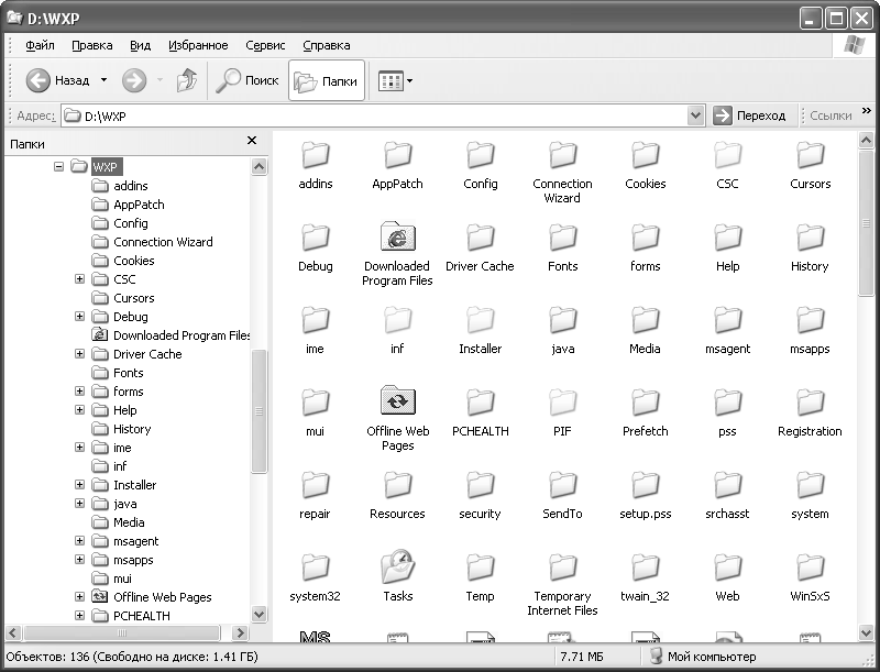 Теперь обратимся к правой части окна. Обычно левая и правая секции окна используются совместно. Так, например, при выполнении команды Вид → Панель обозревателя → Поиск (View → Explorer Bar → Search) в правой секции окна будут выведены результаты поиска. Если в меню Вид (View) воспользоваться командами Панель обозревателя → Папки (Explorer Bar → Folders), то в правой секции отобразится содержимое выбранного объекта. Если щелкнуть по значку какого-либо диска, в правой секции появятся папки и файлы, размещенные на этом диске.