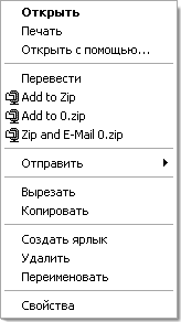 Контекстное меню для файла или папки включает пять-шесть разделов, каждый из которых содержит команды. Приведем три основных раздела с командами, учитывающими тип и структуру выделенного объекта: