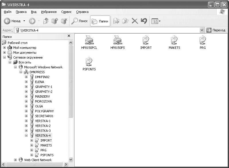 Папка Вся сеть содержит ярлыки общих сетевых ресурсов. В большинстве случаев здесь отображаются гиперссылки, на ресурсы в рабочей группе или в сетевом домене[14]. Перечень гиперссылок корректируется по мере изменения сетевых соединений, а просмотр сетевых ресурсов позволяет быстро определить источник возникновения той или иной проблемы.