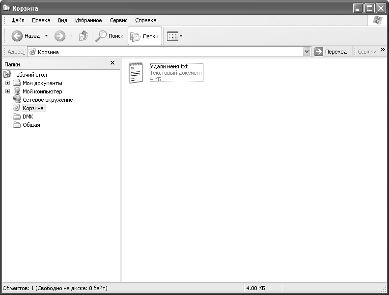Папка Корзина (Recycle Bin) применяется в программе Проводник точно так же, как и самим компьютером. Разрешается перемещать объекты в эту папку, просматривать ее содержимое, стирать все находящиеся в ней объекты (файлы, ярлыки и т. п.) или восстанавливать их в том месте, откуда они были удалены. Совместная работа программы Проводник и папки Корзина весьма эффективна, особенно при необходимости стереть файл, копия которого используется другим приложением. На рис. 2.8 показан файл, который после удаления оказался в папке Корзина.