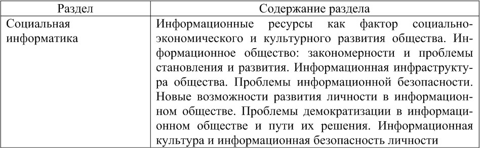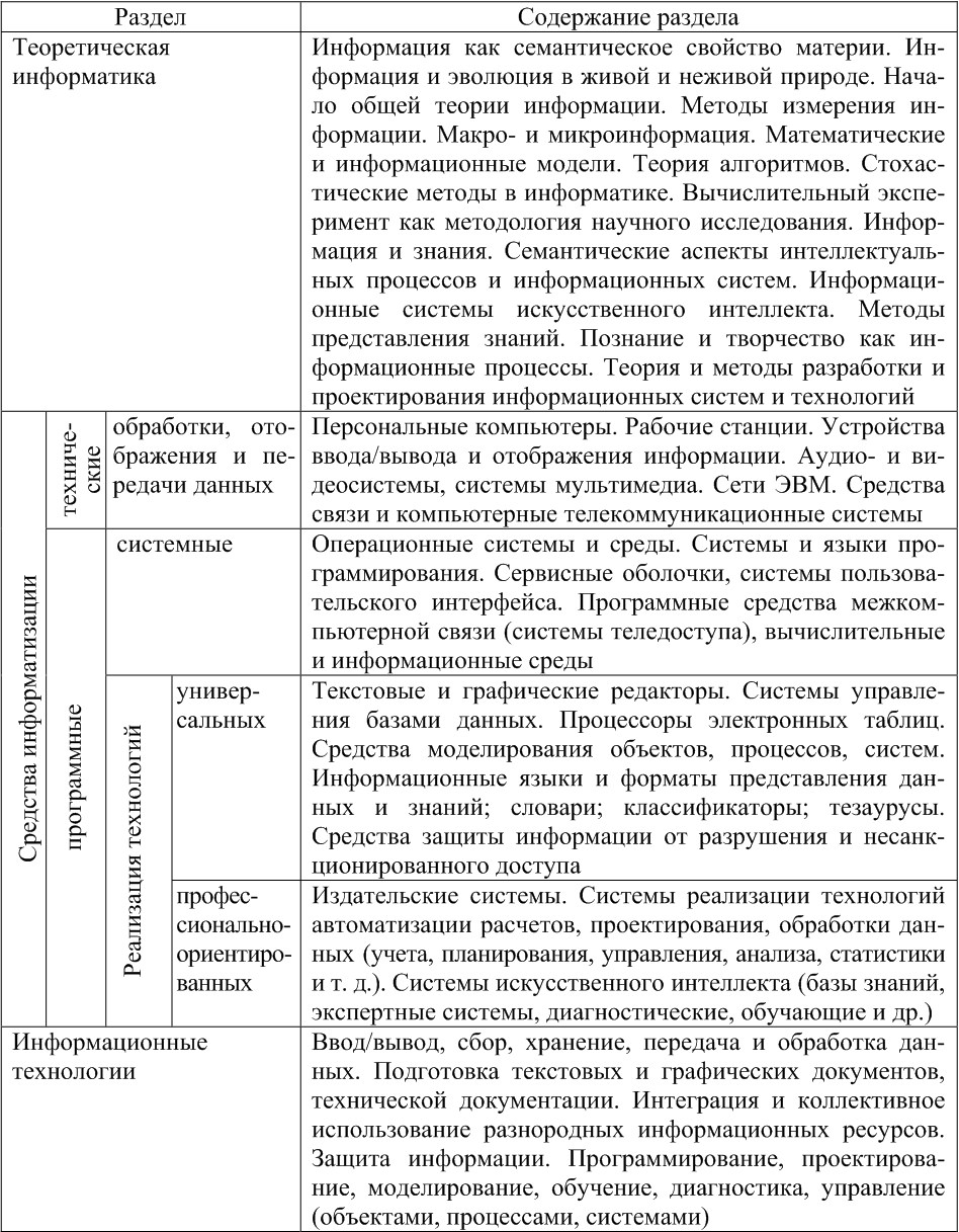Структура предметной области «Информатика» была представлена в Национальном докладе Российской Федерации на II Международном конгрессе ЮНЕСКО «Образование и информатика», согласно которому данная структура (табл. 1) включает четыре раздела: теоретическая информатика, средства информатизации, информационные технологии, социальная информатика [146]. При этом теоретическая информатика содержит философские основы информатики, математические и информационные модели и алгоритмы, а также методы разработки и проектирования информационных систем и технологий.