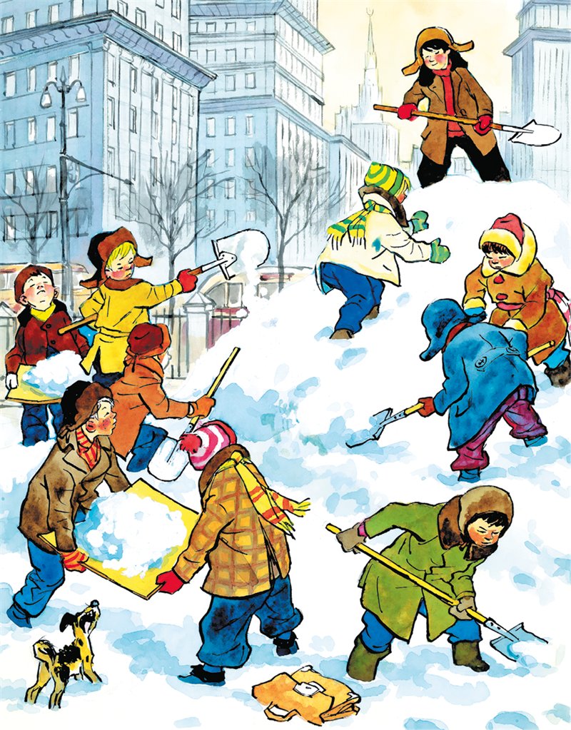 Целый день ребята трудились – строили снежную горку во дворе. Сгребали лопатами снег и сваливали его под стенку сарая в кучу. Только к обеду горка была готова. Ребята полили её водой и побежали домой обедать.
