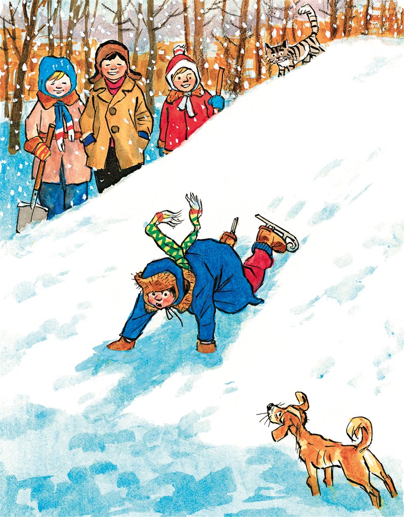 А Котька Чижов из шестой квартиры хитрый какой! Он горку не строил. Сидит дома да смотрит в окно, как другие трудятся. Ему ребята кричат, чтоб шёл горку строить, а он только руками за окном разводит да головой мотает – как будто нельзя ему. А когда ребята ушли, он быстро оделся, нацепил коньки и выскочил во двор. Чирк коньками по снегу, чирк! И кататься-то как следует не умеет! Подъехал к горке.