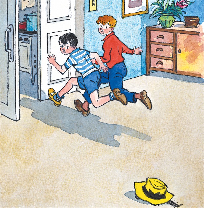 Шляпа вылезла на середину комнаты и остановилась. Ребята смотрят на неё и трясутся от страха. Тут шляпа повернулась и поползла к дивану.