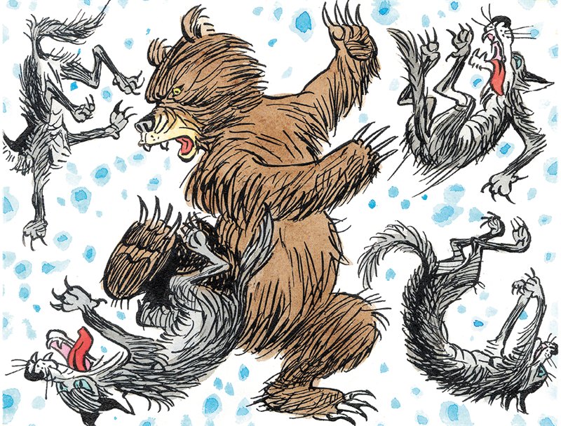 А оказывается, это снег подо мной провалился. Я как полечу вниз и очутился в берлоге. Внизу, оказывается, медвежья берлога была. Медведь проснулся, выскочил от испуга наружу, увидел волков и давай их драть. В одну минуту разогнал всех волчишек.