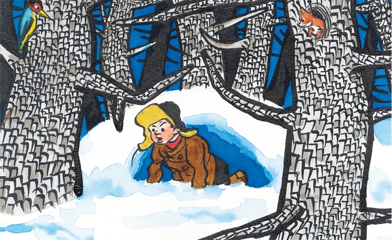Смотрю – дерево. Я на дерево. Волк хотел цапнуть меня, да не успел. Только штаны сзади зубами порвал. Залез я на дерево, сижу на ветке и трясусь от страха. А волк сидит внизу на снегу, поглядывает на меня и облизывается.
