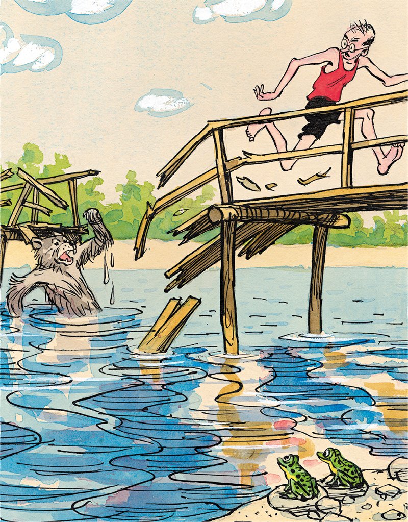 Выбежал я из леса в одной майке и трусиках. Тут впереди речка и мостик через неё. Не успел я перебежать через мостик – как затрещит что-то! Оглянулся я, а это мостик под медведем рухнул. Медведь бултых в речку!