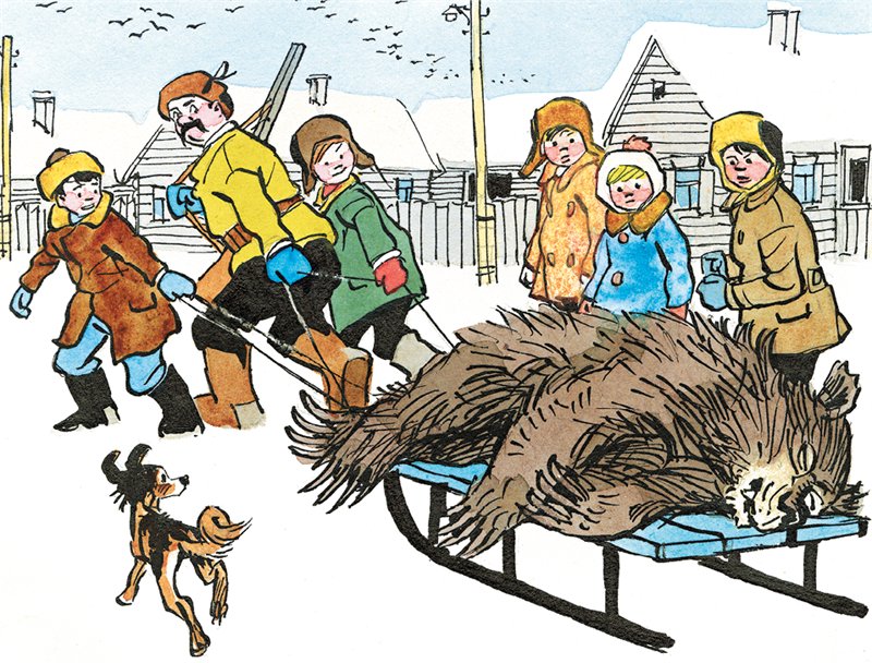 – Я тоже однажды медведя встретил. Это было зимой. Пошёл я в лес. Гляжу – медведь. Я бах из ружья. А медведь брык на землю. Я положил его на санки и повёз домой. Тащу его по деревне на санках. Тяжело. Спасибо, деревенские ребятишки помогли мне его довезти до дому.