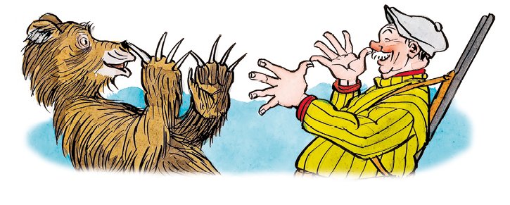 – Я раз тоже в лесу напугался медведя. Только это летом было. Пошёл я однажды в лес, а ружьё дома забыл. Вдруг навстречу медведь. Я от него бежать. А он за мной. Я бегу быстро, ну а медведь ещё быстрей. Слышу, уже сопит за моей спиной. Я обернулся, снял с головы шапку и бросил ему. Медведь на минутку остановился, обнюхал шапку и опять за мной. Чувствую – опять настигает. А до дому ещё далеко. Снял я на ходу куртку и бросил медведю.