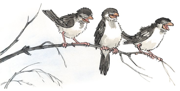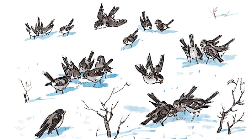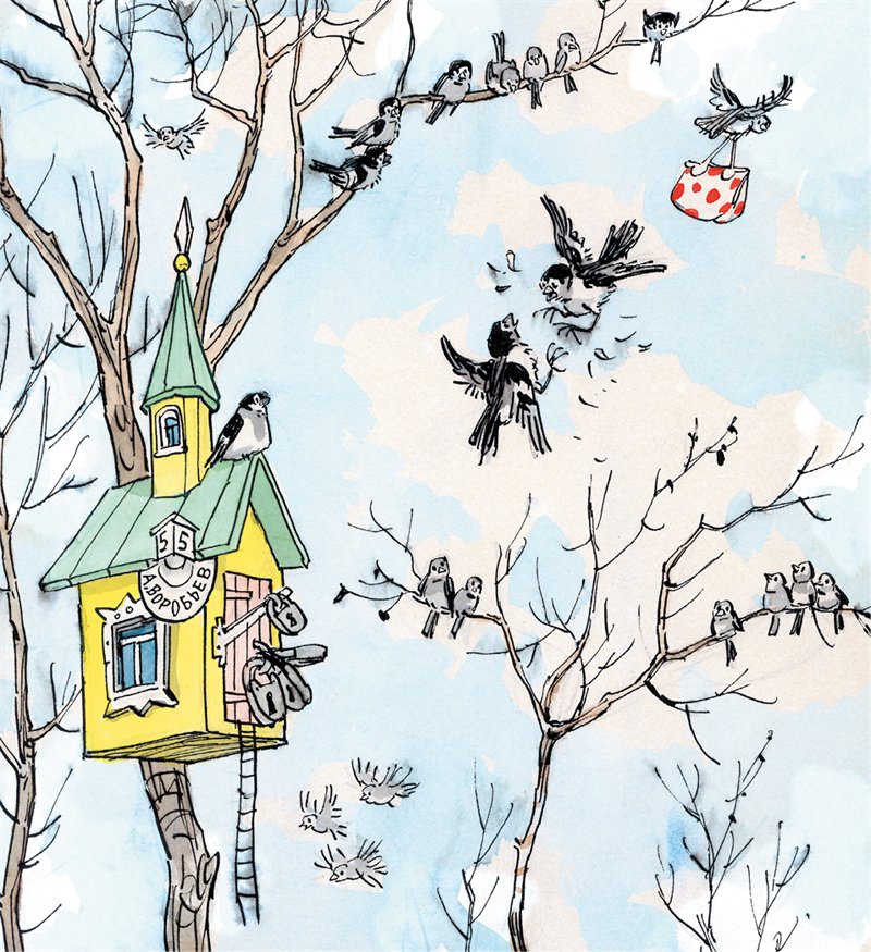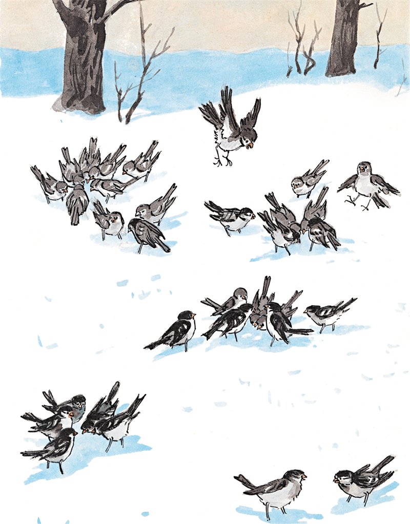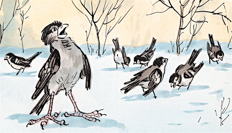 Но вот один воробей набрался храбрости, слетел с ветки и, усевшись на снегу, принялся клевать хлеб. Другой воробей увидел это и тоже спорхнул вниз. За ним спорхнул третий, четвёртый… И скоро вся воробьиная стая уже сидит на снегу и клюёт хлеб. Никто и внимания на прохожих не обращает.
