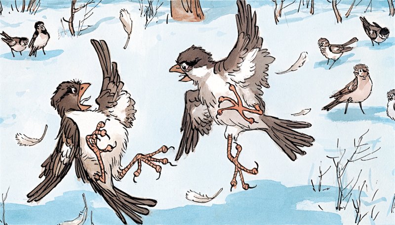 Есть там ещё один вздорный, драчливый воробей-задира. Этот Задира налетит коршуном на какого-нибудь миролюбивого воробья, оттеснит его в сторону, клюнет разок от его куска, тут же налетит на другого воробья, клюнет от его куска, тут же бросится к третьему… То ли его зависть мучит, то ли чужие куски кажутся слаще, но он только и делает, что на других бросается! В конце концов ему попадётся такой же, как он, забияка или же просто неуступчивый воробей, который сам чужого не хочет, но и своего не отдаст. Тут-то они и начнут наскакивать друг на друга, сталкиваться грудью и взлетать кверху, словно два петуха. Задира так и норовит побольней ковырнуть своего соперника носом. Но и соперник не уступает. Так они в драке и про хлеб-то забудут. Словом, смех, да и только!