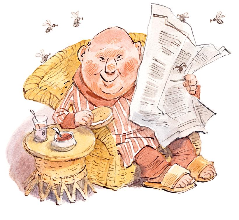 Он сидел за столом и делал сразу четыре дела: 1) ел белый хлеб с маслом; 2) пил чай с вареньем; 3) читал газету; 4) непрестанно отмахивался и отплёвывался от мух, которые роем носились над ним, поминутно садясь ему на лысину и попадая в чай.