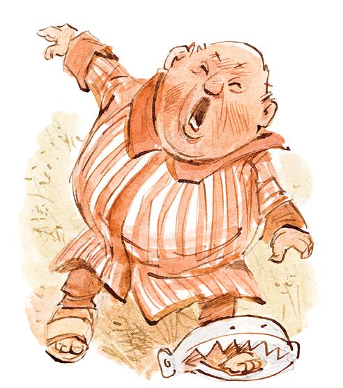 Ничего не подозревая, Незнайка продолжал уплетать малину, как вдруг снизу раздался щелчок, и он почувствовал, как его что-то крепко схватило за ногу. Незнайка вскрикнул от боли и, нагнувшись, увидел, что нога его попала в капкан. В этот же момент следивший за каждым его шагом Фикс выскочил из своей засады и, подбежав к Незнайке, изо всех сил стукнул его метлой по голове.